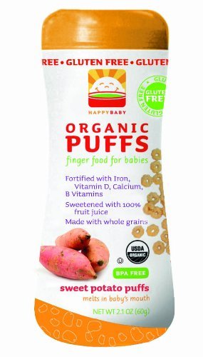 - CERTAIN CONTENT Happy Baby Sweet Potato Puffs THAT APPEARS ON THIS Â COMES FROM AMAZON EU. THIS CONTENT IS PROVIDED AND IS SUBJECT TO CHANGE OR REMOVAL AT ANY TIME.