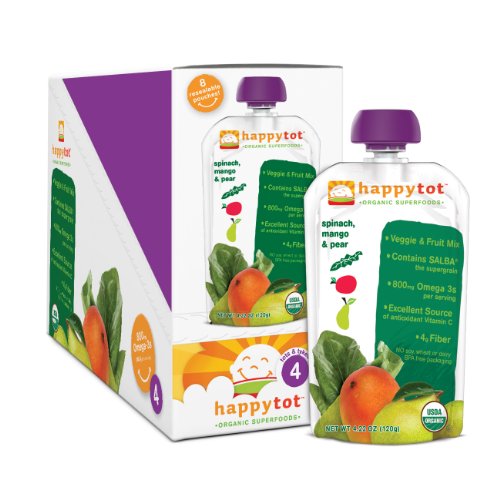 - CERTAIN CONTENT Happy Tot Organic Baby Food, Stage 4, Spinach, Mango and Pear, 4.0-Ounce Pouches (Pack of 16) THAT APPEARS ON THIS Â COMES FROM AMAZON EU. THIS CONTENT IS PROVIDED AND IS SUBJECT TO CHANGE OR REMOVAL AT ANY TIME.